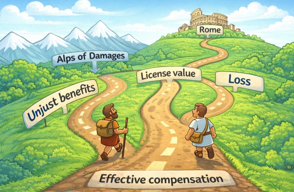 The Directive is clear in its spirit: damages must be compensatory, not punitive. The objective is neither enrichment nor sanction, but fair restoration of the actual harm suffered. If that is so, then all three conceptual elements — unjust enrichment, loss suffered, and the hypothetical license fee — are not distinct destinations. They are simply different roads. And all roads lead to Rome: the effective damage caused.